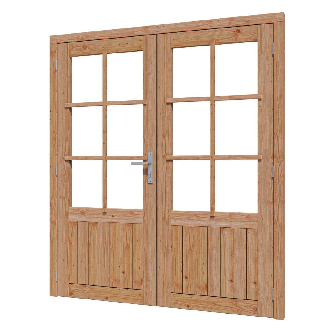 Sluit je schuur, veranda of buitenverblijf goed af met onze stevige douglas houten glasdeuren. De deuren zijn onbehandeld en worden geleverd inclusief kozijn, roedeset en hang- en sluitwerk.
